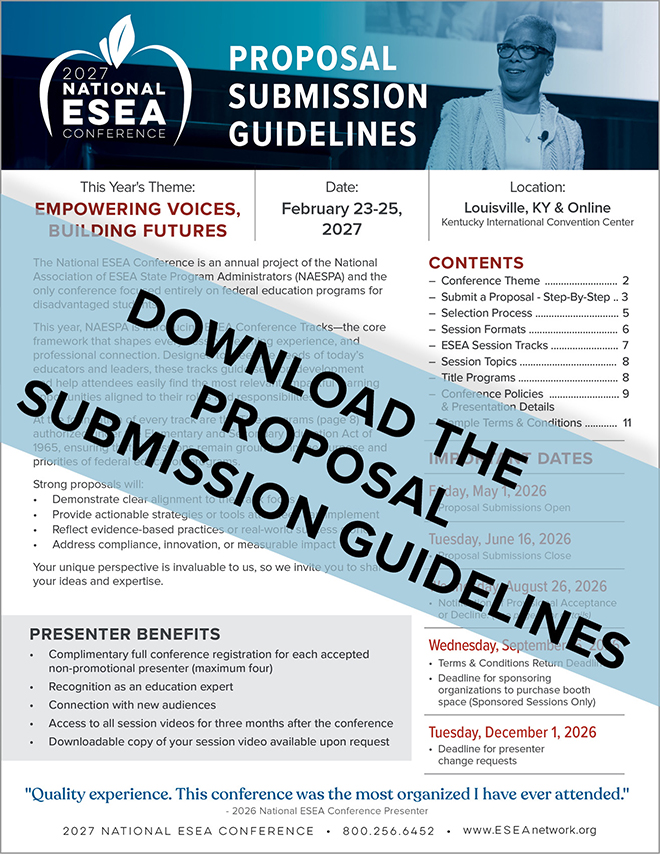 Proposals for presentations at the 2027 National ESEA Conference in Louisville, KY and online, will be open May 1st through June 16th, 2026. Don't miss out on this opportunity to showcase your expertise and insights to a national audience. Remember, no submissions will be accepted after the deadline, so mark your calendars and submit your proposals on time. We can't wait to see what innovative ideas you bring to the table!